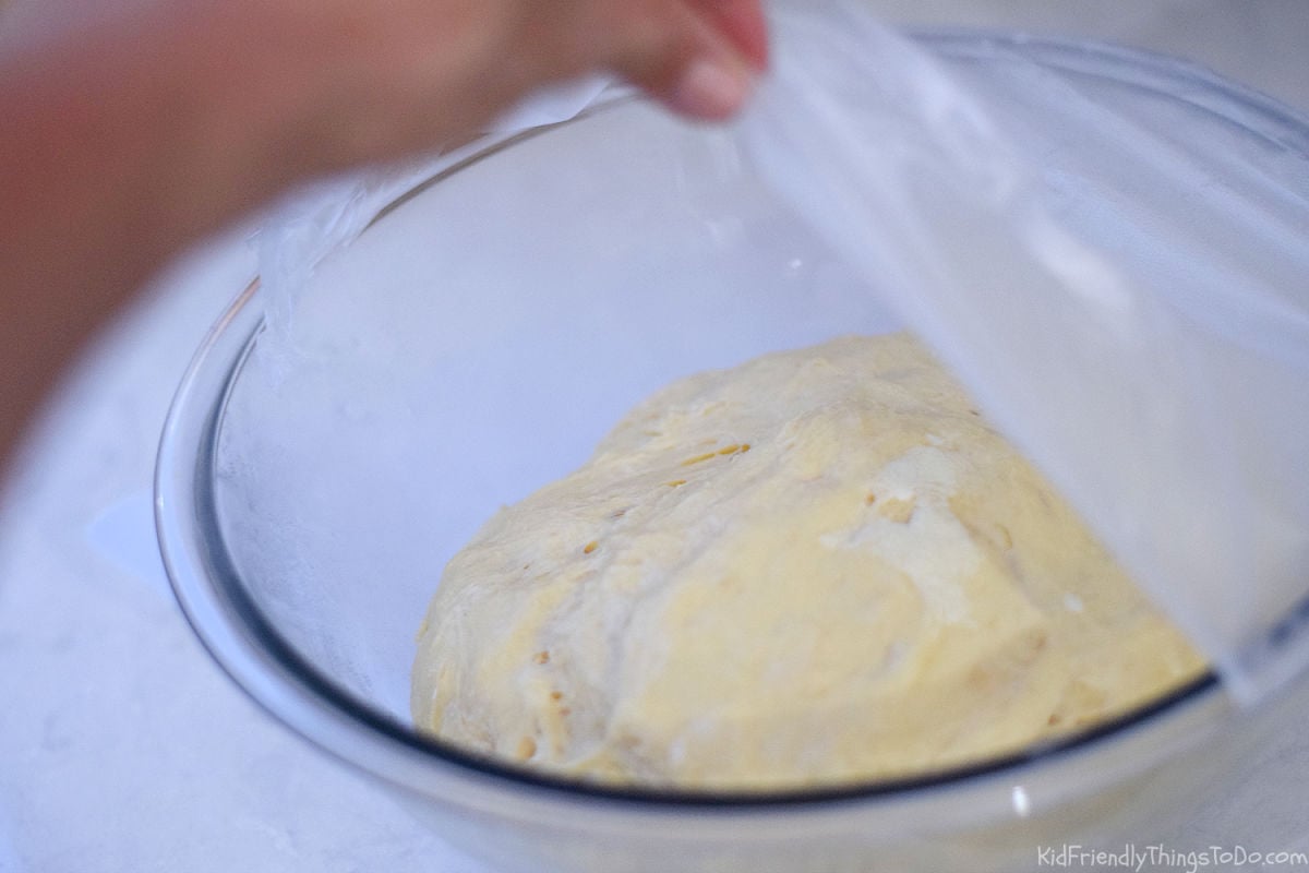 - Place the dough into the bowl, and flip it around so it is fully coated